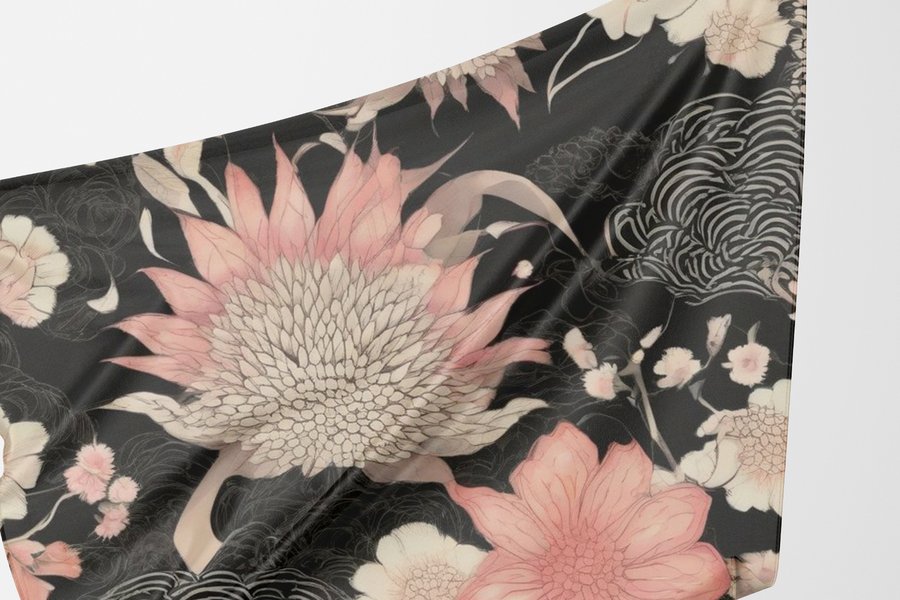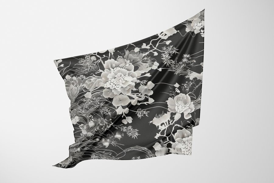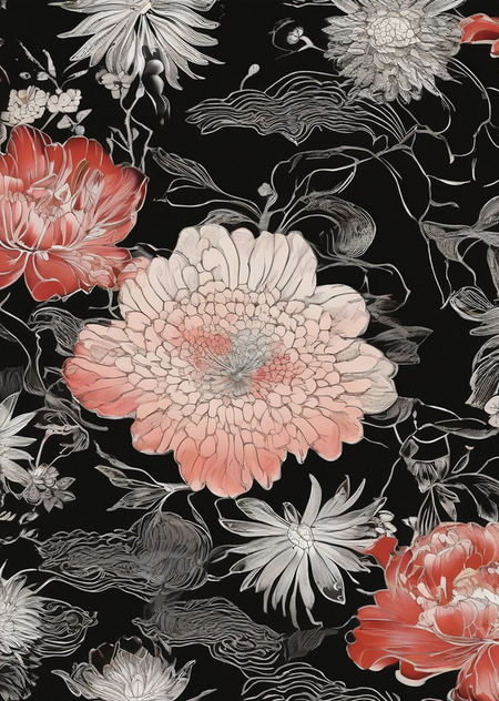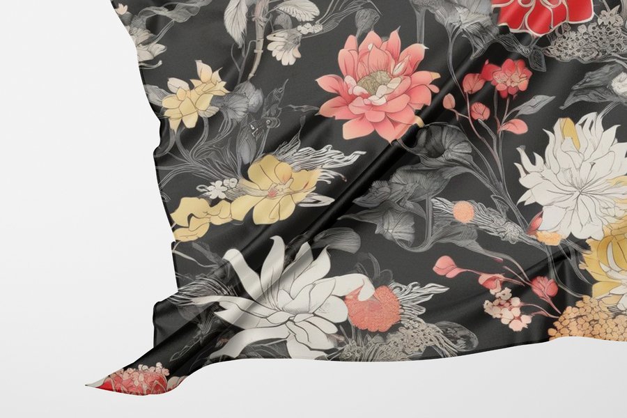 1. surrealistic japanese flowers pattern on black for square printing on textile