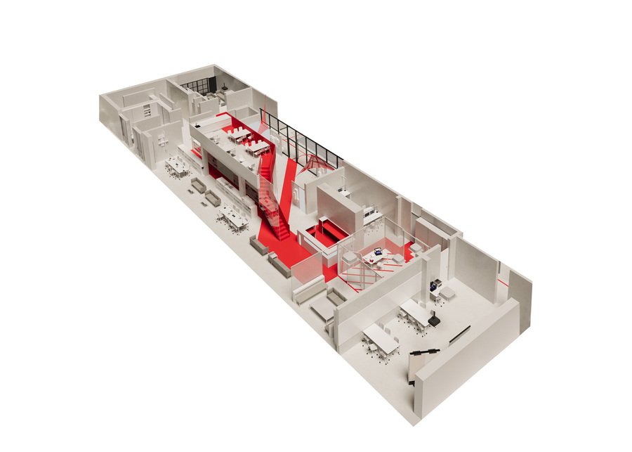 Используются основные принципы модернизма: чистота, линейность форм, функциональность, лаконичность. Красный цвет используется для передачи идеи соединения всех частей в единое целое и связан с авангардным направлением, в рамках которого существовал конструктивизм.