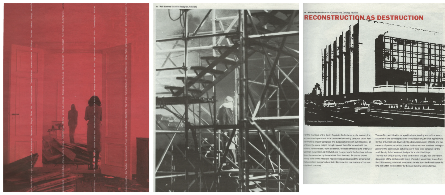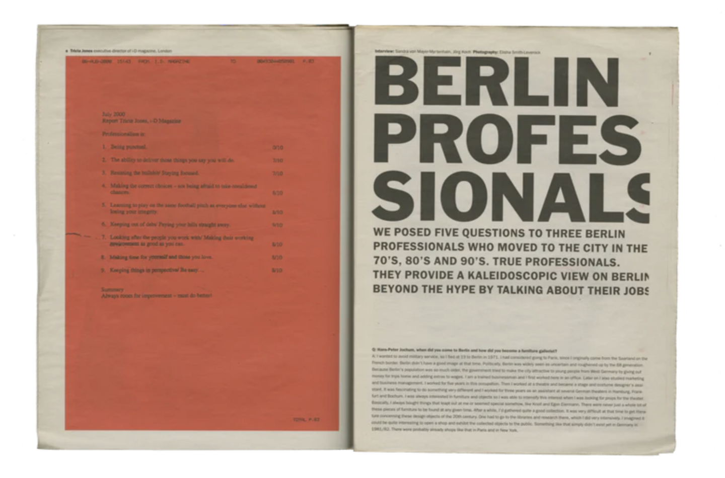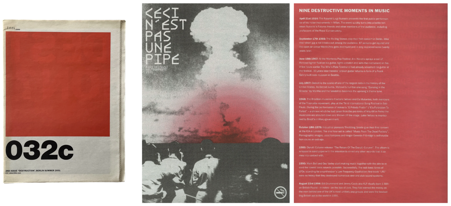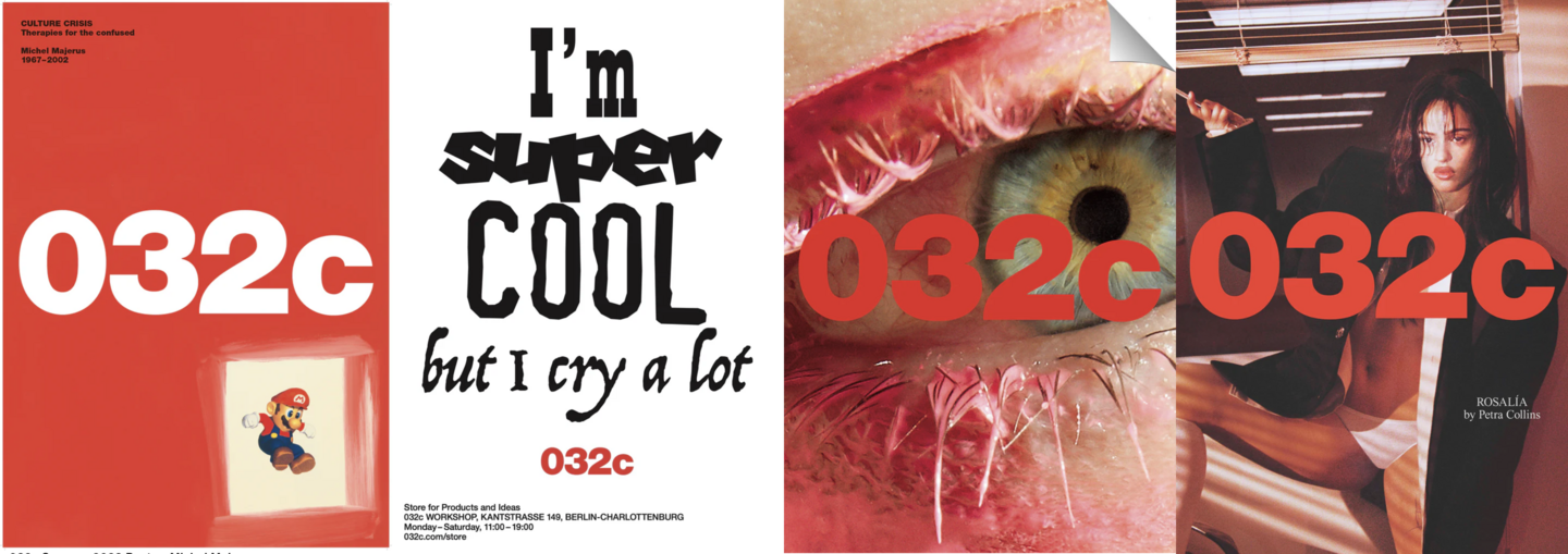Визуальная идентичность 032c формировалась на фоне культурных процессов начала 2000-х, когда Берлин активно становился европейской столицей независимого искусства, клубной сцены и альтернативных медиа. Журнал с первых номеров транслировал эстетику постиндустриального города — резкую, минималистичную, экспериментальную — и использовал её как основу своего визуального языка. Яркий оттенок красного Pantone 032c, выбранный в качестве названия, стал ключевым культурным кодом, который объединил в себе агрессивность, утопичность берлинской сцены.
