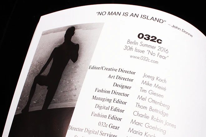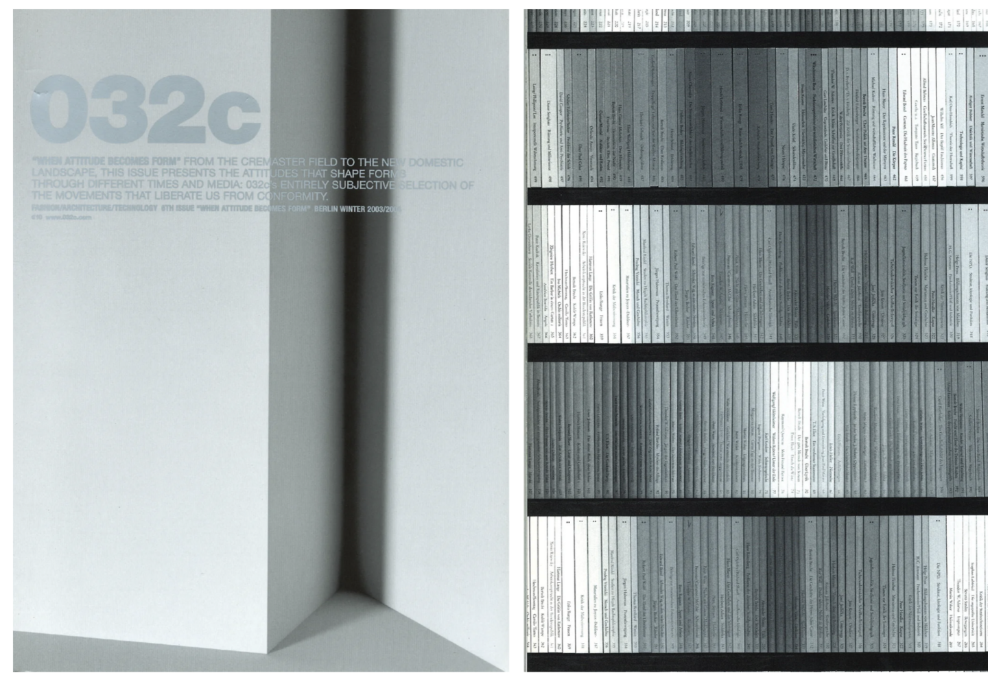 Первый номер 032c вышел зимой 2000/2001 года и сразу обозначил себя как независимое, концептуальное издание.