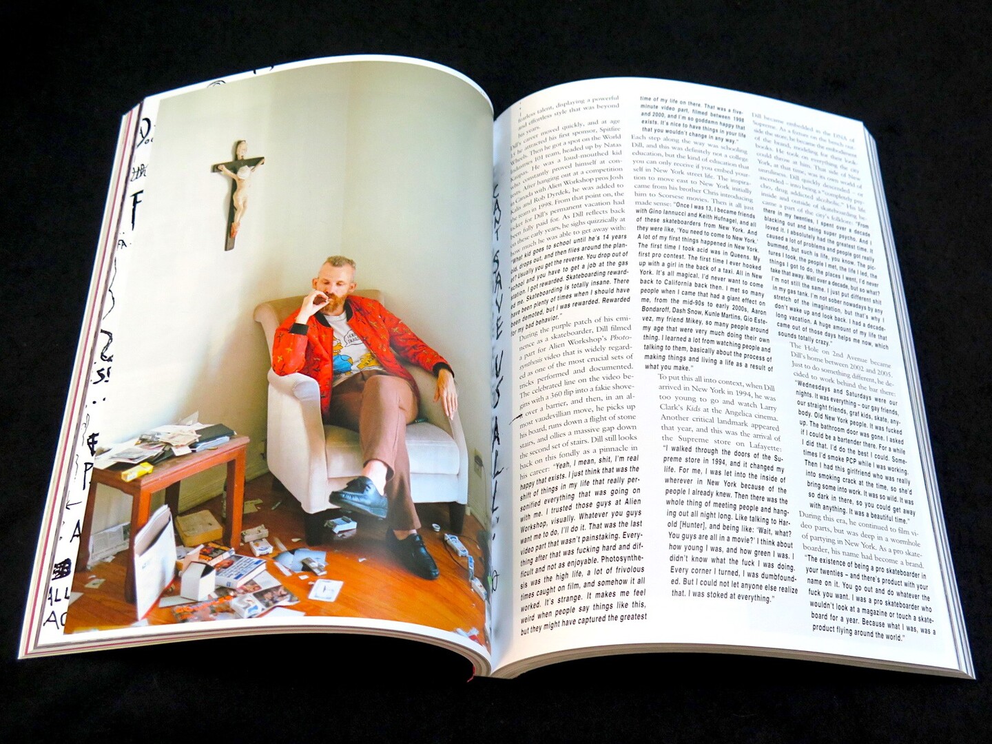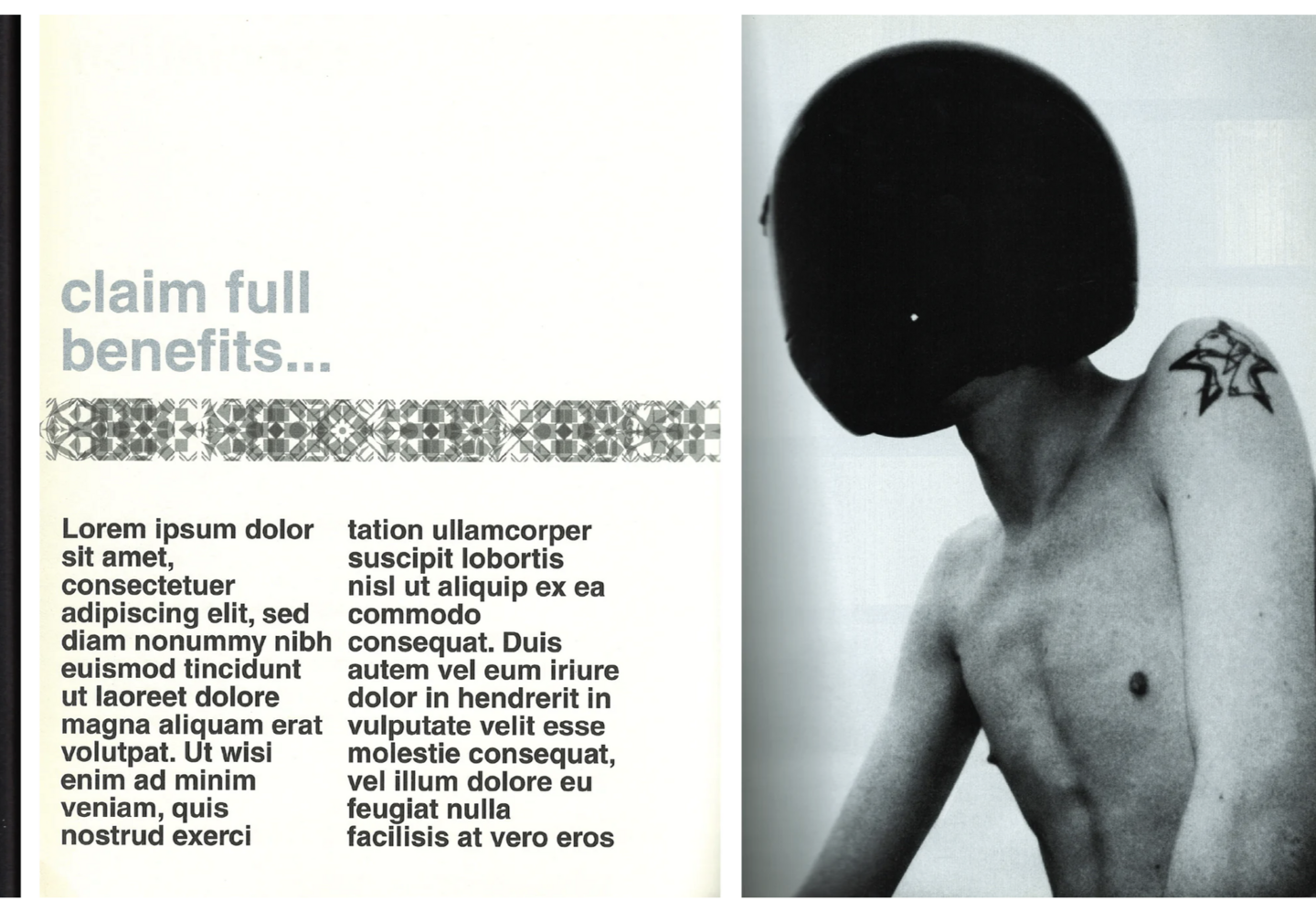 Внутренняя структура 032c строится на принципе строгой модульности, при которой сетка задаёт ритм всего выпуска. Обычно используется двух- или трёхколоночная система с широкими полями, позволяющая создавать ощущение «воздуха» и подчеркивать материальность бумаги. Поля и расстояния между колонками выступают важными выразительными средствами: они задают баланс между текстом и изображением и формируют характерный для 032c медленный темп чтения. Многие развороты строятся на контрасте плотного текстового блока и крупной фотографии, выведенной на весь разворот, — это создаёт переходы между аналитическим и визуальным режимами.