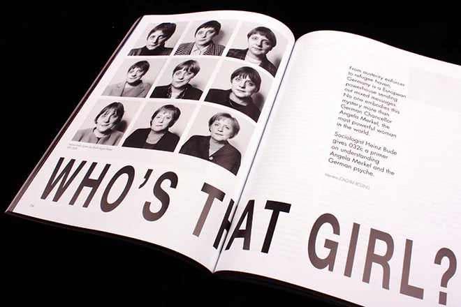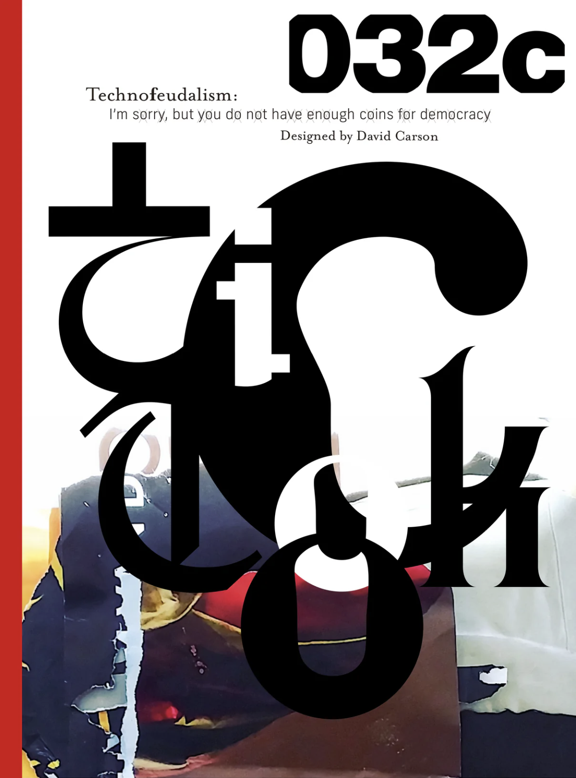 Типографическая система 032c основана на использовании гарнитур, связанных с традицией швейцарского модернизма. Иерархия кеглей строится на резком контрасте между крупными, иногда плакатными заголовками и спокойным, функциональным основным текстом. Интерлиньяж, как правило, увеличен, что создает ощущение легкости и подчёркивает аналитический темп чтения.