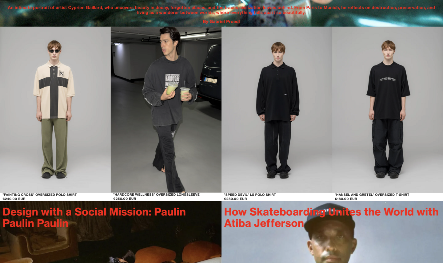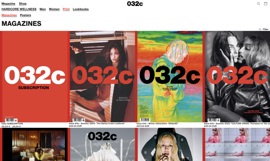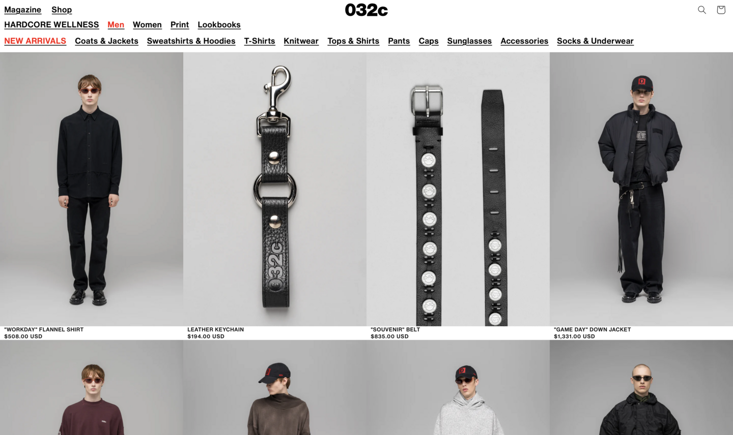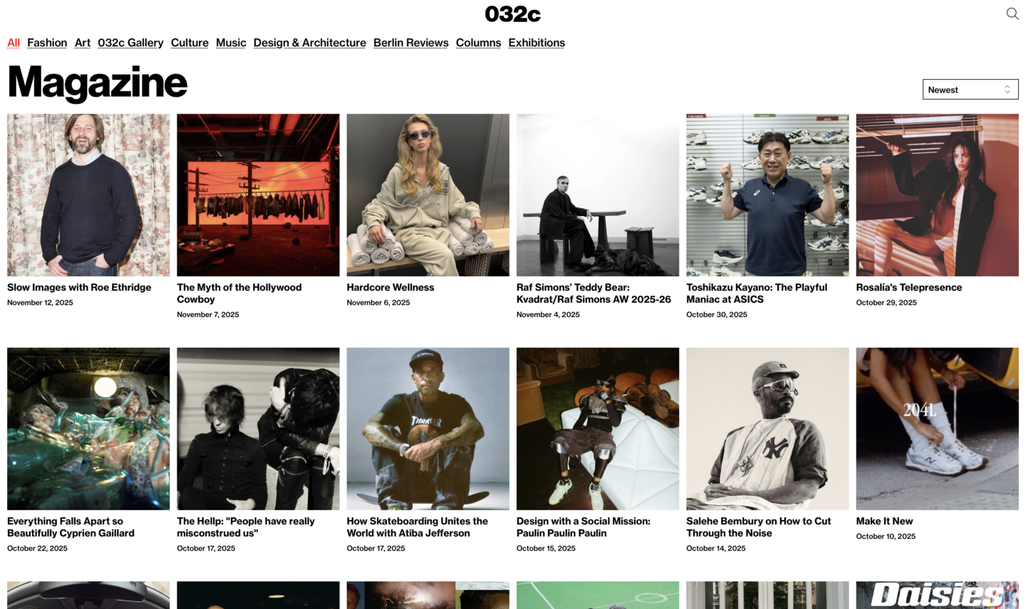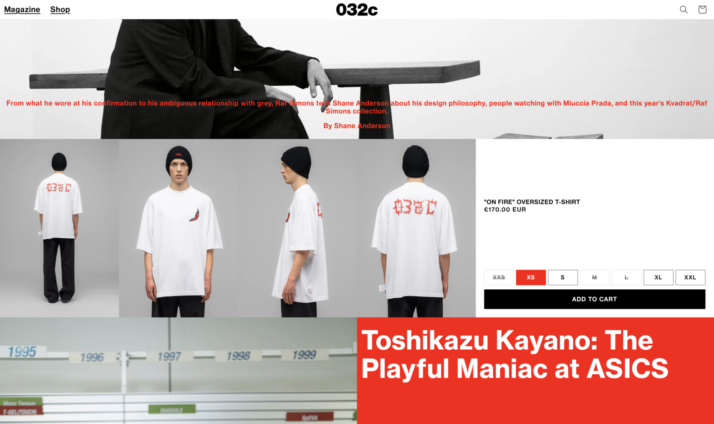 Цифровое присутствие 032c выстроено как расширение печатной эстетики, но не как её буквальное повторение. Сайт журнала сохраняет характерную строгость: минималистичная структура, широкие поля, крупная типографика и преобладание черно-белых элементов создают ощущение визуальной дисциплины, близкой печатной верстке. Навигация строится по принципу спокойных, почти выставочных переходов между материалами — большая часть пространства отдается изображениям, а текст подается лаконично, с четкой иерархией.