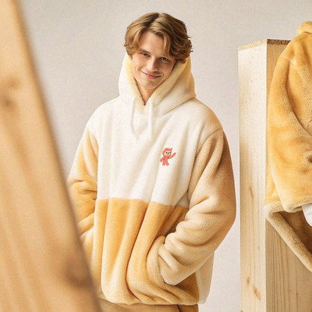 image promt: A modern, high-quality white hoodie with a warm, biege aesthetic. The hoodie features a garage logo and animals masckot, including soft biege gradients integrated into the fabric. The fit is slightly oversized, with soft and fluffy texture. The hoodie is worn by a young male model with a soft smile, facing the camera in a perfectly straight-on angle. The background is a soft, neutral gradient to keep the focus on the product.