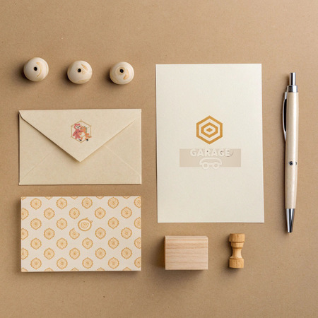 1)image promt: Create a layout of branded printed material, top view (letter, envelope, business card, pen) for the brand GARAGE for kids educational products. The logo should be in light biege color with bold letters. The main design elements are in biege colours and the backround contains some biege wooden montessori toys