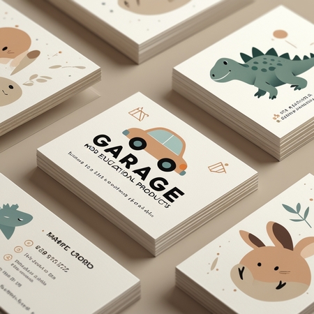 2)image ptomt: Make a business card for the brand for kids educational products named garage, add beige colors and neutral biege backround with some wooden montessori toys