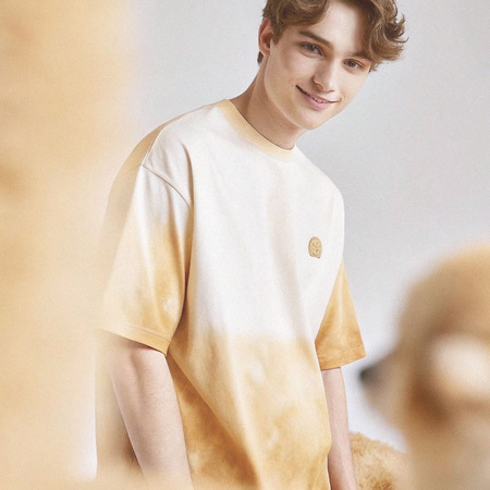 image promt: A modern, high-quality white t-shirt with a warm, biege aesthetic. The t-shirt features a garage logo and animals masckot, including soft biege gradients integrated into the fabric. The fit is slightly oversized, with soft and fluffy texture. The t-shirt is worn by a young male model with a soft smile, facing the camera in a perfectly straight-on angle. The background is a soft, neutral gradient to keep the focus on the product.