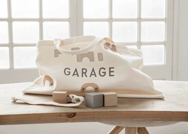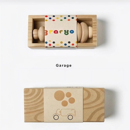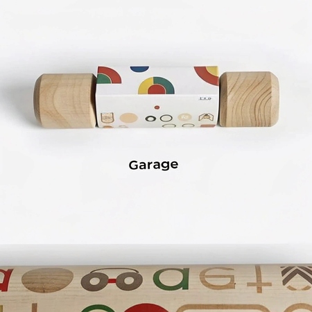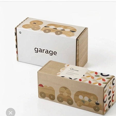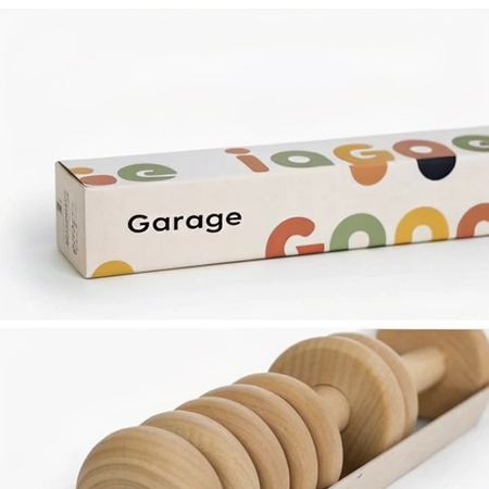 image promt: Packaging design for children’s developmental products brand «GARAGE», clean and modern aesthetic, predominantly neutral color palette with splashes of bold primary colors, incorporating illustrations of wooden toys and playful typography, durable material suitable for shipping and storage, environmentally friendly packaging solution that appeals to both children and their parents