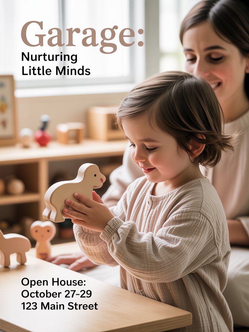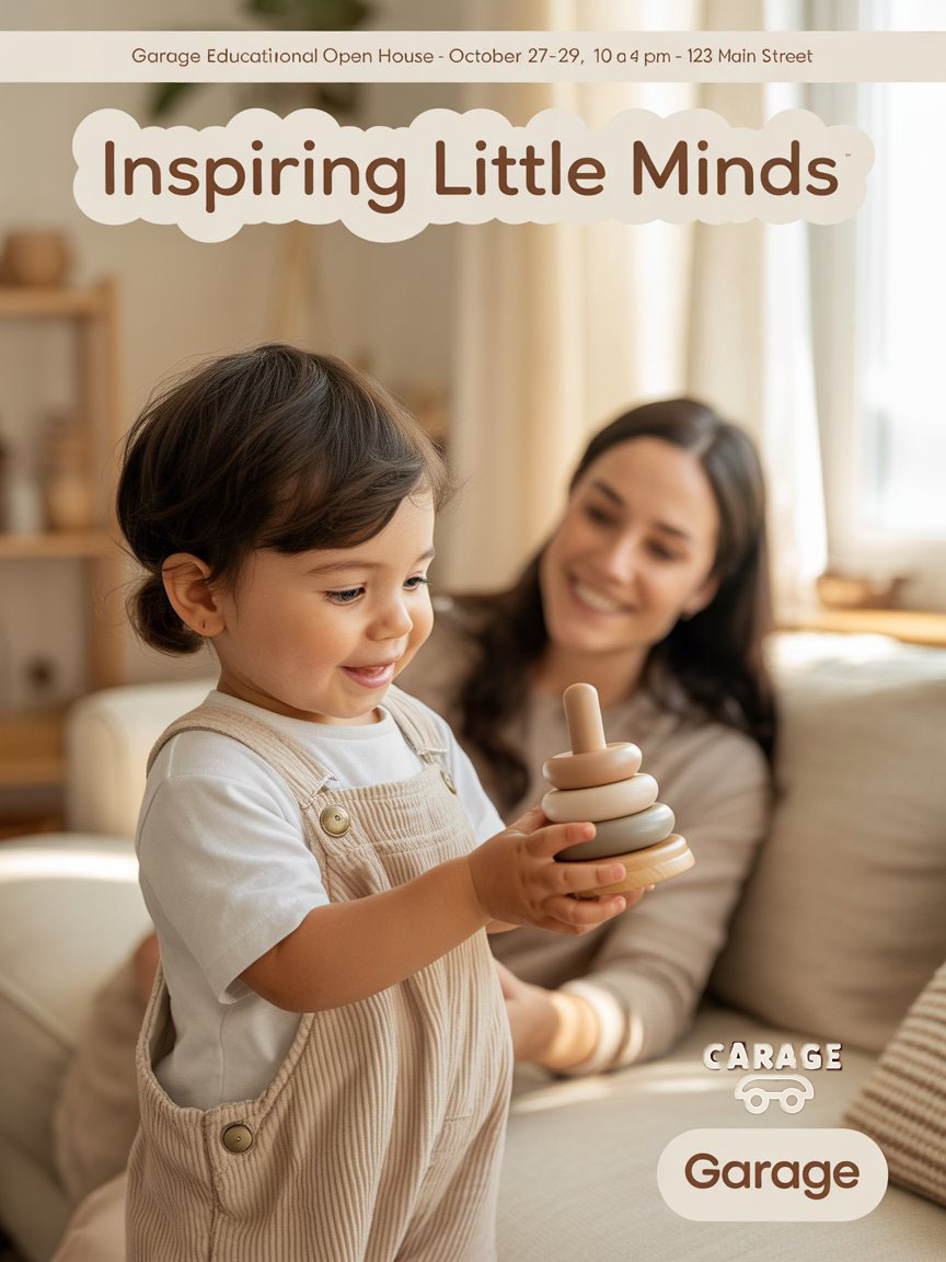 image promt: Сreate a promotional poster for the brand GARAGE for kids educational products. The poster should feature a child in biege clothes with biege montessori wooden toy in their hand to show what the brand is for. use soft typography with bold headlines so i will look calming and child-friendly. The overall design should be calm, soft in biege colors, focusing on happy children and happy mothers. include key details such as the brand name, dates, and location in a clear and attractive layout