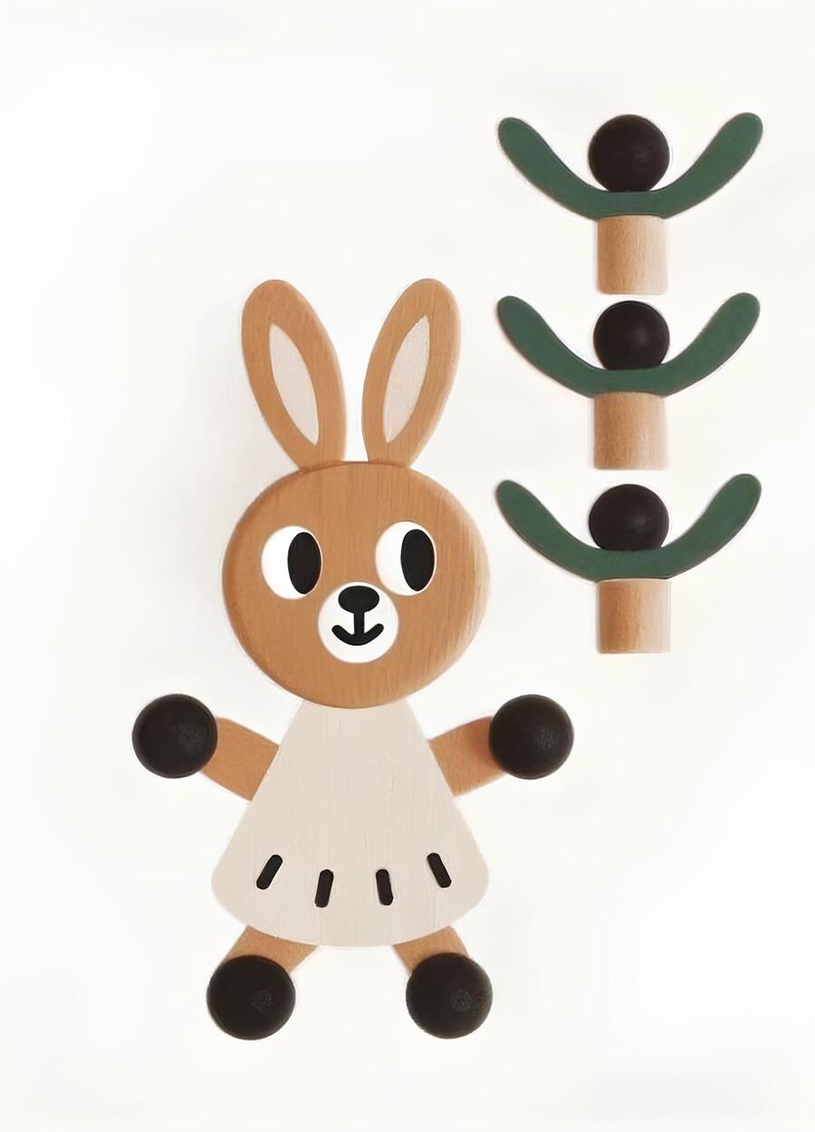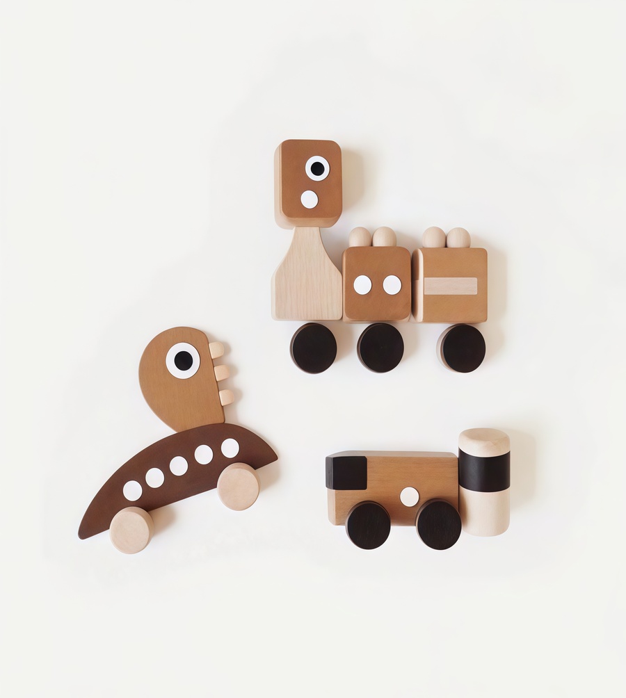 image promt: Сreate wooden toys based on dinosaur, rabbit and squirrel