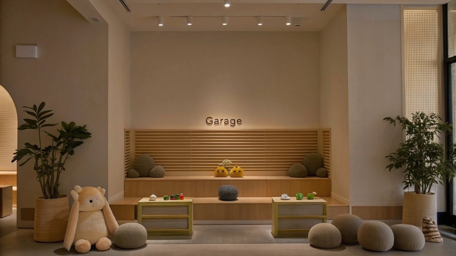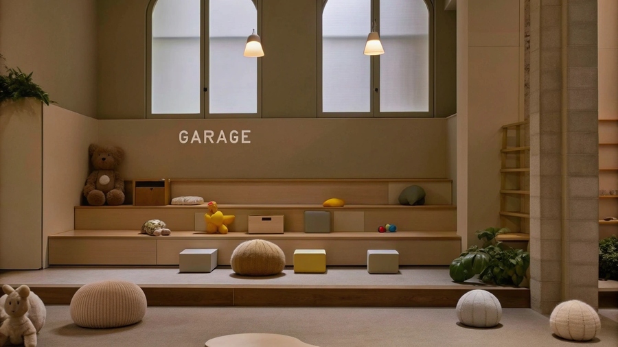 image promt: Exterior view of children’s development brand store «GARAGE», prominent signage in beige tones, wooden facade accents, large windows flooding the interior with natural light, welcoming entrance area designed for both children aged 4-12 and their mothers, spacious sidewalk seating area featuring comfortable benches and tables at child’s height, landscaped surroundings with greenery and playful sculptures, overall calm and inviting aesthetic reflecting the brand’s values of simplicity, warmth, and creativity