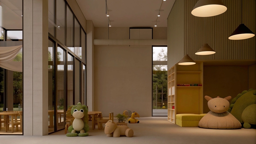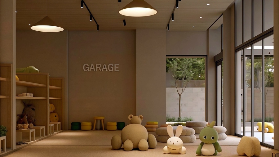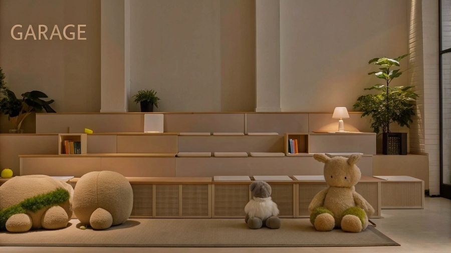 image promt: Children’s development brand space «GARAGE», light and spacious interior, predominant use of beige tones, wooden furniture, simple but stylish design, large fluffy plush toys like squirrel, dinosaur, rabbit, comfort-focused layout for kids aged 4-12 and their mothers, low-height seating areas for children, diffused lighting from big windows and dimmed lamps, no harsh lights, only warm and pleasant illumination, educational elements integrated into the decor, special activity zones included