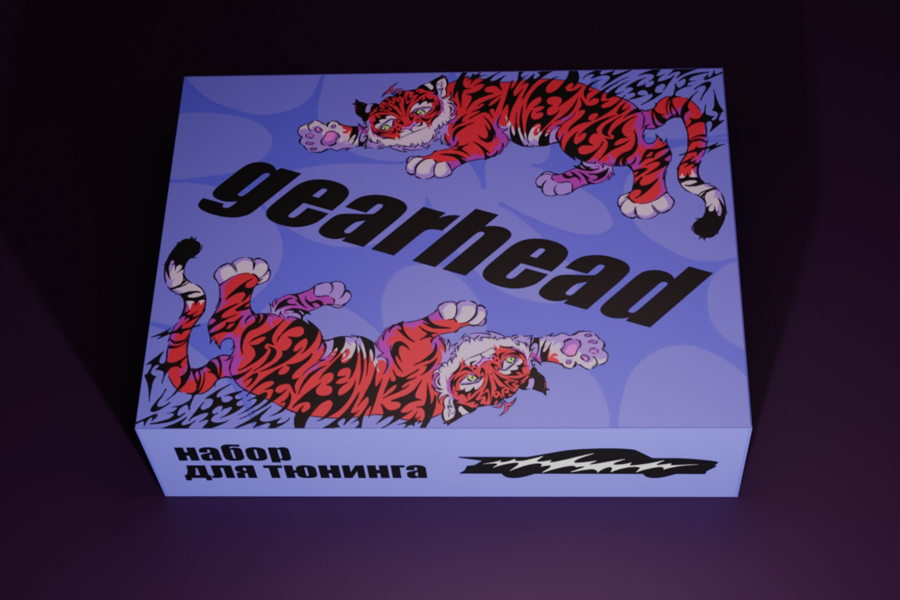 create a similar 3D model visualization box based on this photograph. there must be text «GEARHEAD» and tigers on the product. it can be placed against a black fabric background. make the image look stylish and unusual, focusing on the tribalism style. make it look like a studio shoot.