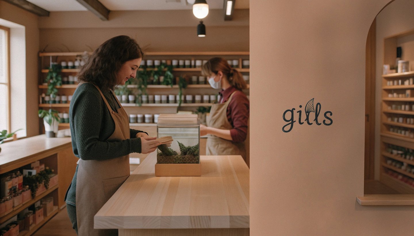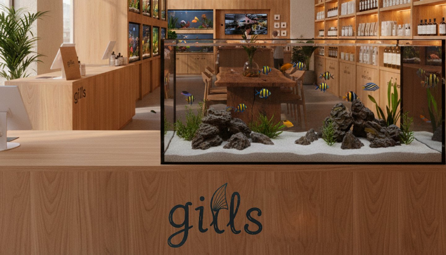 Промт: A calm, poetic interior scene inside the boutique aquarium store «gillls.» The store employee is standing beside a small aquarium on a wooden counter, gently explaining fish care to a customer. The atmosphere feels intimate, educational, and warm, filled with natural light.