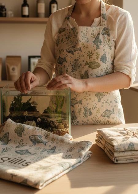Промт: A set of natural linen store textiles for the brand «gillls» — aprons, cloth bags, and soft wraps — featuring the organic hand-drawn aquatic pattern of the brand.