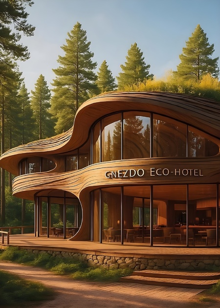 A stunning architectural concept of the main building for GNEZDO ECO-HOTEL, designed as a modern «nest» in the forest. The structure blends natural materials — wood, glass, and stone — with organic curved shapes inspired by nature. Large panoramic windows open to the trees; the roof is covered with greenery and plants. Soft warm lighting glows from inside, creating a feeling of calm and eco-luxury. The building serves as a central hub with a reception, lounge, and restaurant. Surrounded by tall pine trees, wooden terraces, and forest pathways. The atmosphere is serene, minimalist, and sophisticated — a sanctuary of modern nature design.
