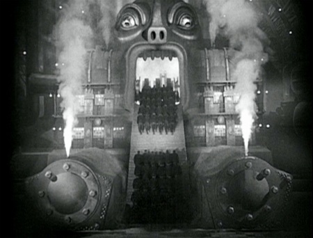 Метрополис — это вертикально разделённый город-государство: в небе летают самолёты, а глубоко под землёй рабочие живут в катакомбах в ужасных условиях рядом с машинами, которые показаны как бог-людоед по имени Молох. Визуальная метафора превращается в ужасающие своими размерами декорации, где глубокие, падающие на ряды рабочих тени, подчёркивают обезличенность и масштаб угнетения. Светотень демонстрирует тени от машин как символ механического труда.