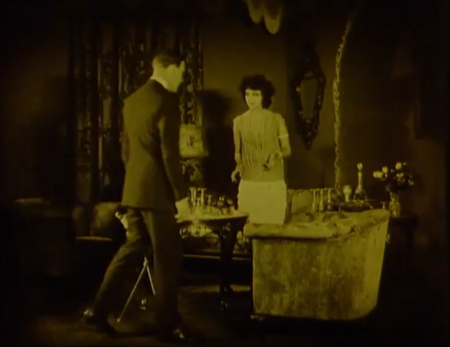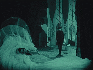 Известная сцена встречи в ночи Сомнамбулы со спящей Джейн Олсен поразила зрителей совей атмосферой. Затемнённые углы выделяют фигуру женщины, тем самым указывая на резкий контраст с чёрным силуэтом Чезаре, который по сюжету пришёл лишить героиню жизни. Он сам, как и здешние декорации в комнате, не выглядит человечным или сколько-нибудь реальным. Светотень подчеркивает мистическую атмосферу и надвигающуюся катастрофу, а заострённые декорации и контраст цвета плёнки только усиливают напряжённость сцены.