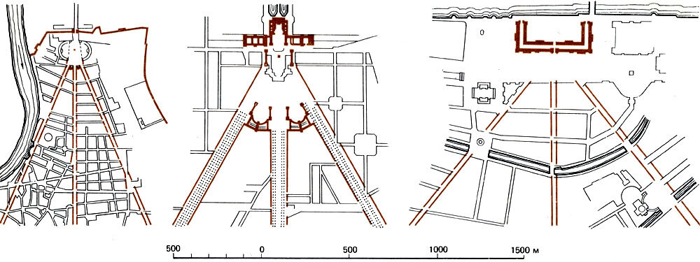 Планы лучевых уличных систем Рима (слева), Версаля (в середине) и Петербурга (справа). Масштаб чертежей общий, 1979 г.