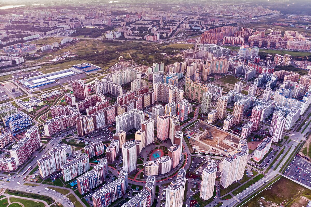 Это обусловлено тем, что пока не появилось альтернативы исторически сложившемуся центру города и все жизненные потоки происходят здесь. Одновременно с этим он не может вместить в себя все ветки развития города и найти в себе место для новых, современных пространств, отвечающих разным запросам. И такие пространства стихийно появляются в новых, безликих труднодоступных территориях. Важно заметить, что в этих микрорайонах невозможно узнать Санкт-Петербург, они не могут отвечать статусу культурной столицы. Такие районы строятся стихийно, очень плотно, с минимальным количеством социальных объектов и дорог. На фото — мкр. Кудрово, Санкт-Петербург, 2019 г.
