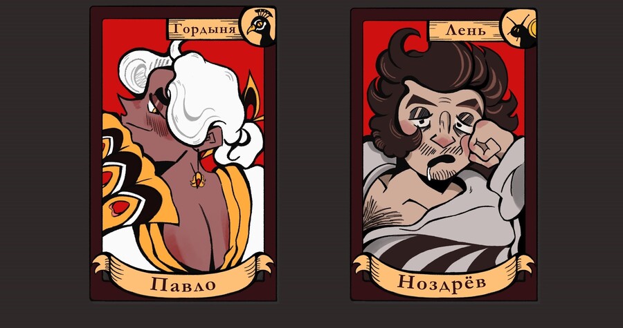 Каждый игрок имеет одну карту персонажа, олицетворяющая тот или иной смертны грех, а также карту умения этого греха.