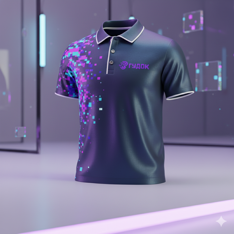 Each item should clearly feature the Гудок logo and reflect the brand’s futuristic identity: a clean design in purple, blue, and white tones, with neumorphic pixel details, chrome or glass-like textures, and soft glowing highlights. The merchandise should look modern, minimalistic, and tech-inspired, symbolizing digital connection and time communication, while maintaining a sense of elegance and innovation.