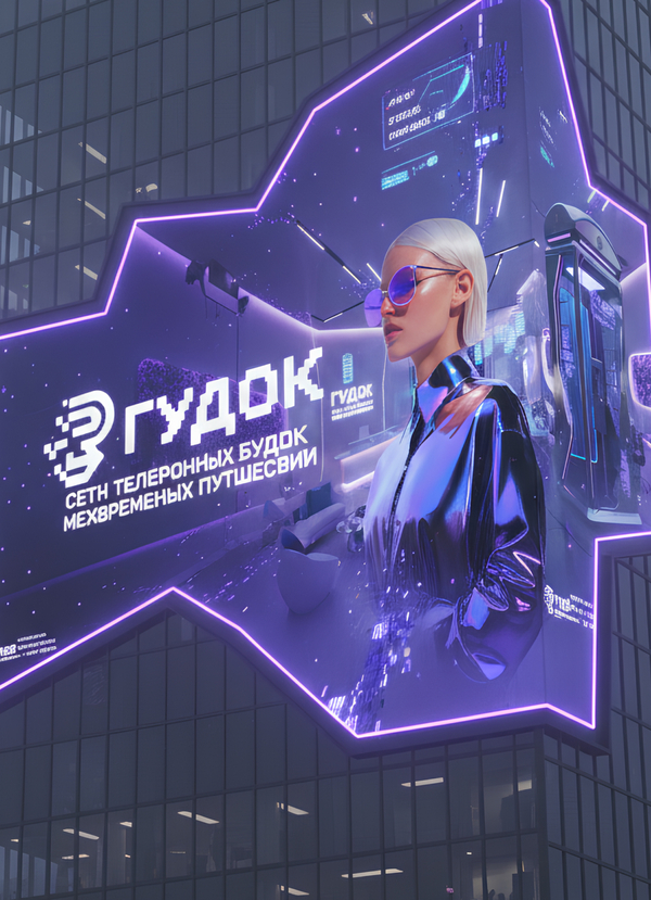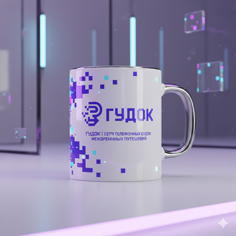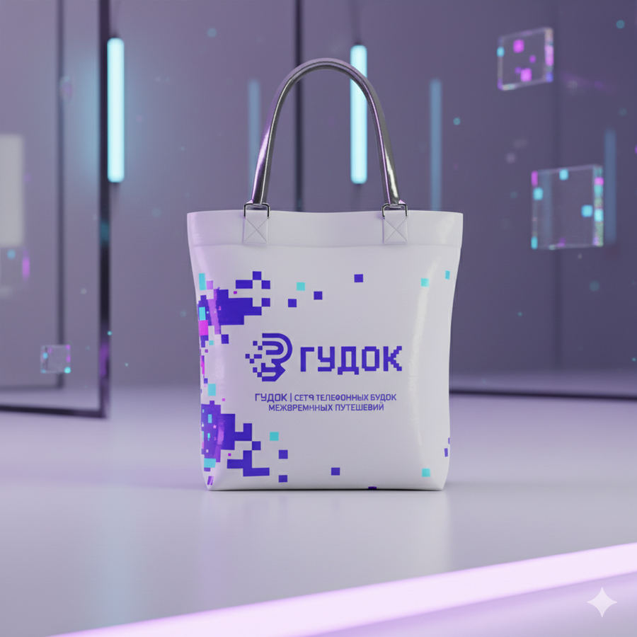 Gemini prompt: Create a realistic 3D render of a futuristic telephone booth for the brand Гудок, placed outdoors. The booth should feature the Гудок logo and follow the same branding identity: futuristic design in purple, blue, and white tones, with neumorphic pixel textures and chrome or glass details. The shape should feel modern and slightly abstract, symbolizing communication through time. The environment is an urban street or square, softly illuminated, with reflections and a hint of mist for atmosphere. The booth should look functional yet mysterious, blending technology and art — a portal for intertemporal connection.