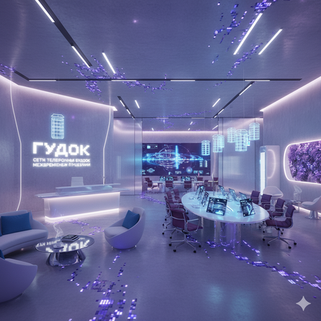 Gemini prompt: Create a futuristic interior or architectural render for the «Гудок» (Gudok) headquarters — (entrance area / office workspace / relaxation zone).