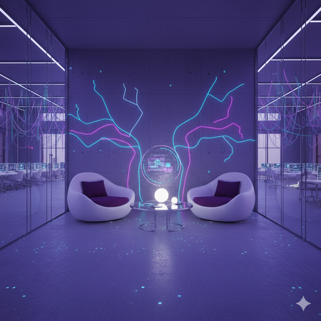 The design should follow the brand’s visual identity: a futuristic style in purple, blue, and white tones, with neumorphic pixel textures, chrome and glass accents, and soft glowing lighting. The space should look modern, technological, and slightly mysterious, symbolizing communication across time. Add elegant details like smooth curved surfaces, digital or holographic elements, and subtle reflections that emphasize intelligent futurism and calm sophistication.