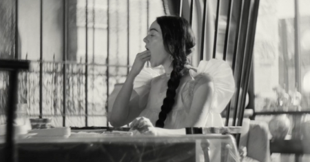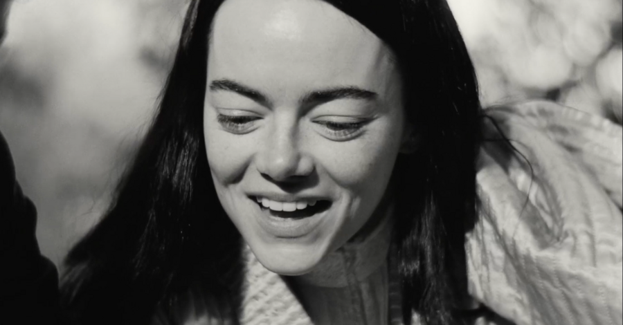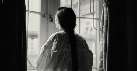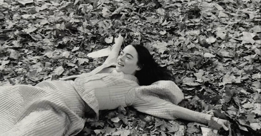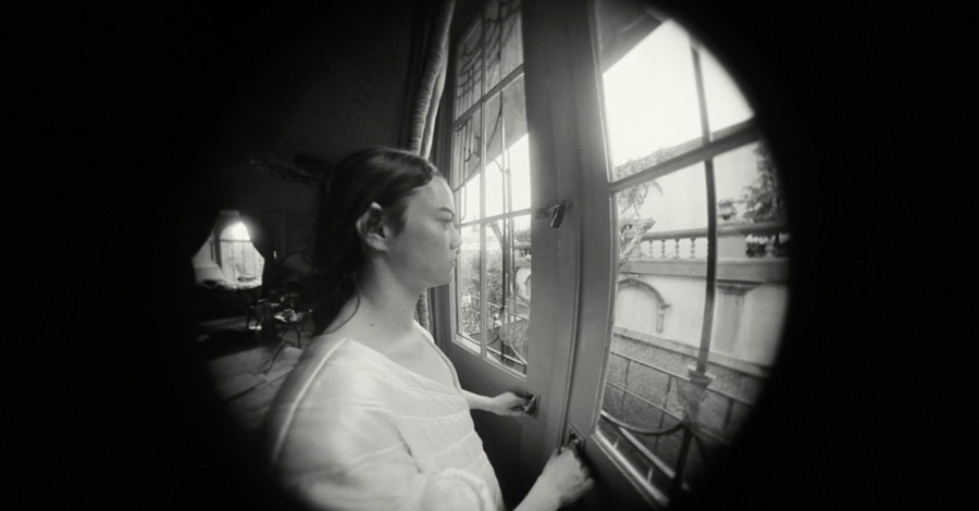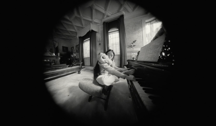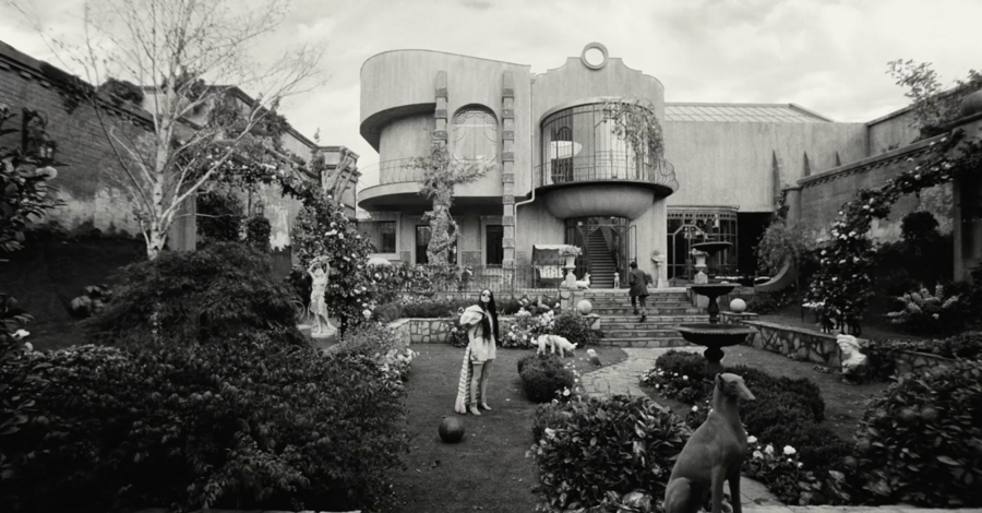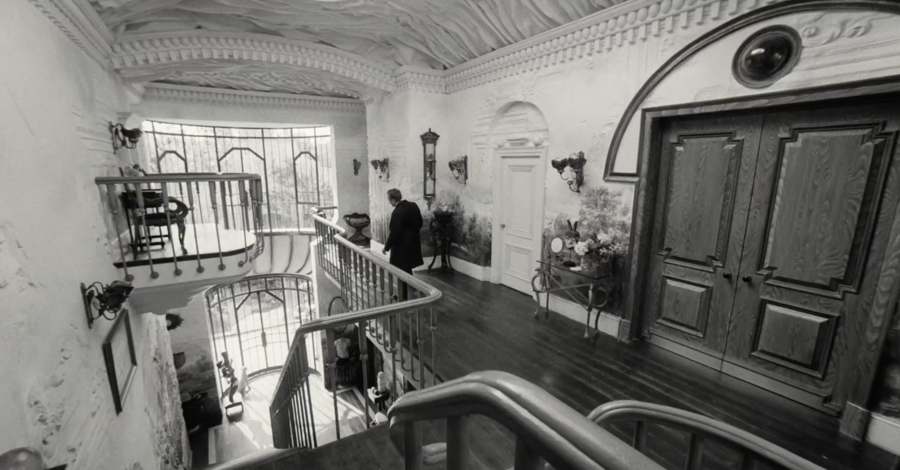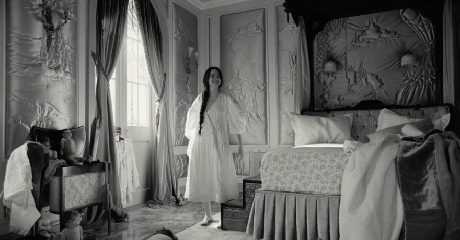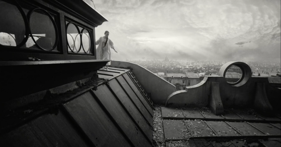 примечательно, что вступительная сцена цветная, более того, цвета максимально выкручены, они выразительные и акцентные. после такой атмосферной, завораживающей сцены сразу же идет чёрно-белая заставка, после которой мы, как зрители, сразу же погружаемся в такой же чёрно-белый мир. мир героини возрождённой после смерти.