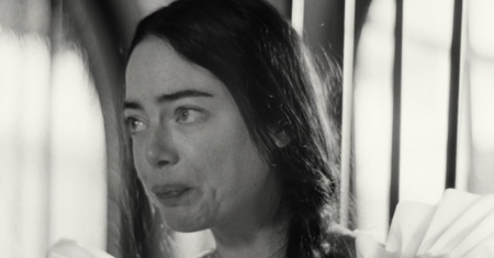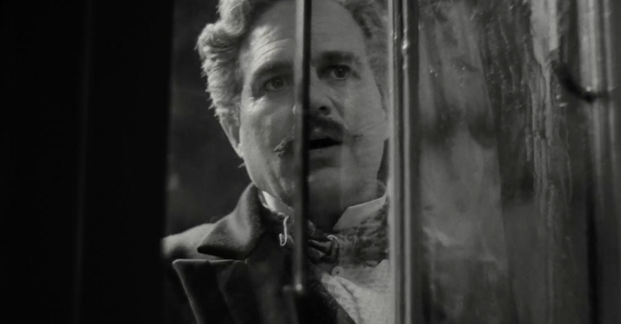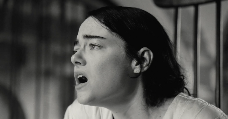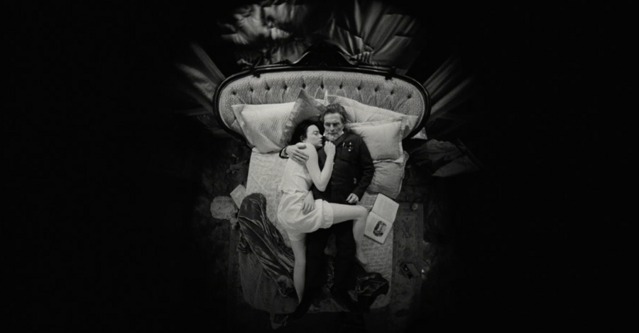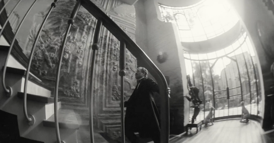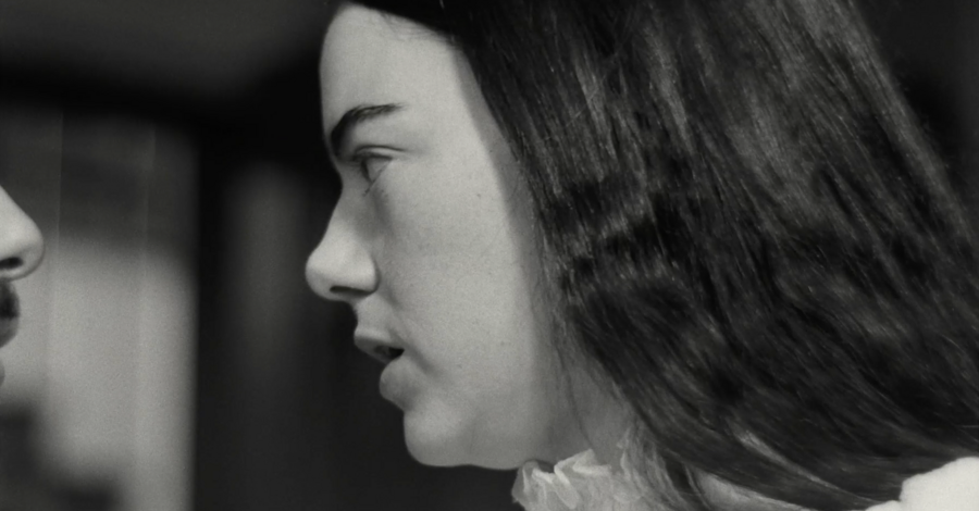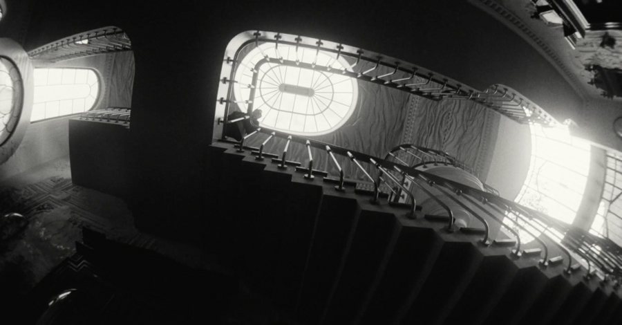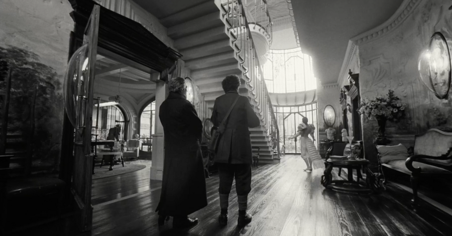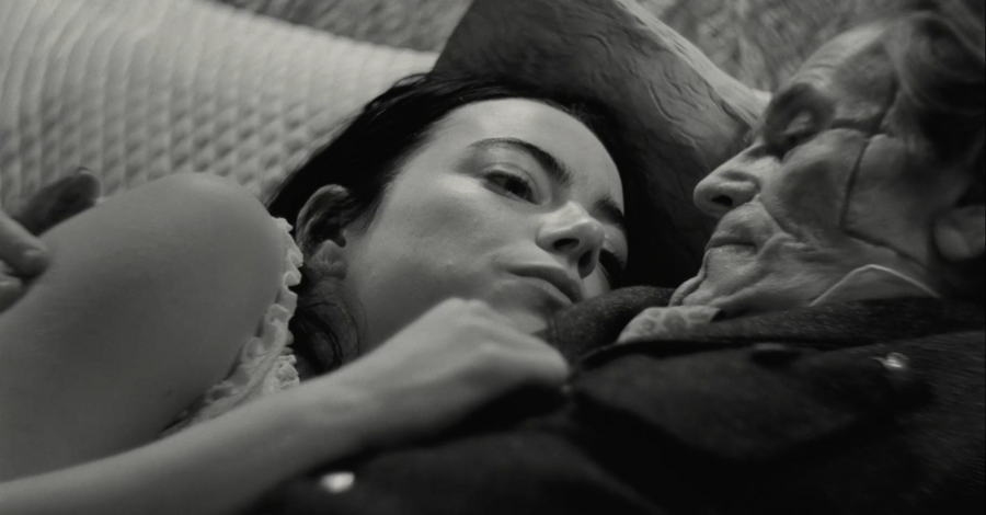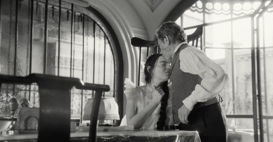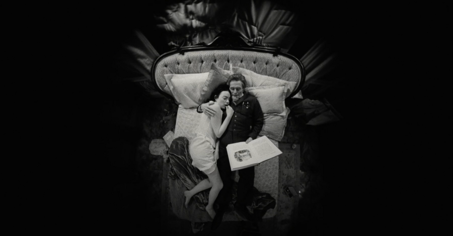 мы смотрим на Годвина с ракурса ребенка, который медленно поднимает голову, чтобы проследить за взрослым. Даже, когда он подходит к дверному проходу, мы можем заметить, как Белла (Эмма Стоун) поднимает на него взгляд сверху вниз, она кажется намного меньше и не такой значимой, как Годвин.