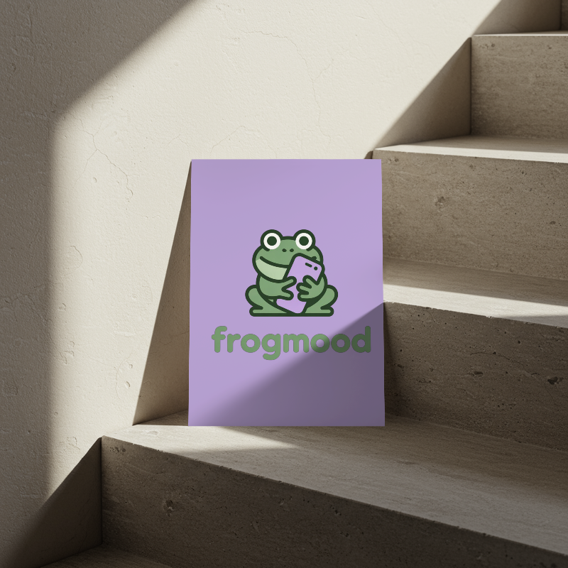 Ideogram.ai, запрос: Vector minimalistic logo for business selling phone accessories featuring cute minimalist frogs named FrogMood in green, purple and white colors with phone in a frog shape