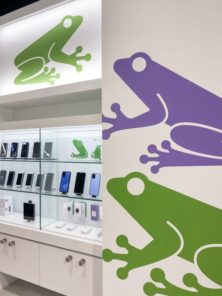 ideogram.ai, запрос: Photo of a mobile accessories store decorated with minimalist vector frogs in green, purple, and white colors