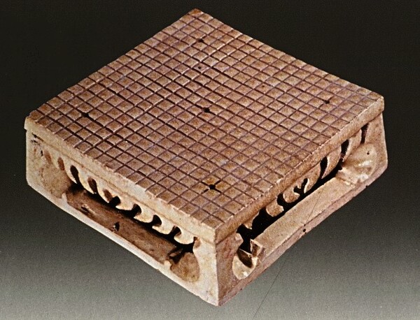 Фрагмент грубо сделанной доски для Го, эпоха Западной Хань (206-25 гг до н. э.) // Доска Го из белой керамики. Найдена в захоронении эпохи династии Суй (581-618 гг)