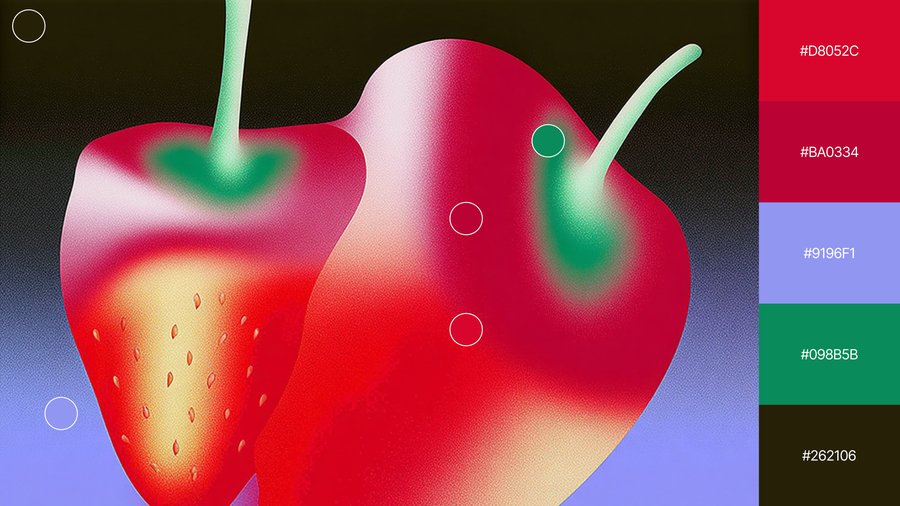 3. Midjourney: 2D-illustration of glossy strawberries, soft grain texture, vibrant gradient bg, smooth shading, abstract digital illustration, high contrast, front view (на основе первого изображения).