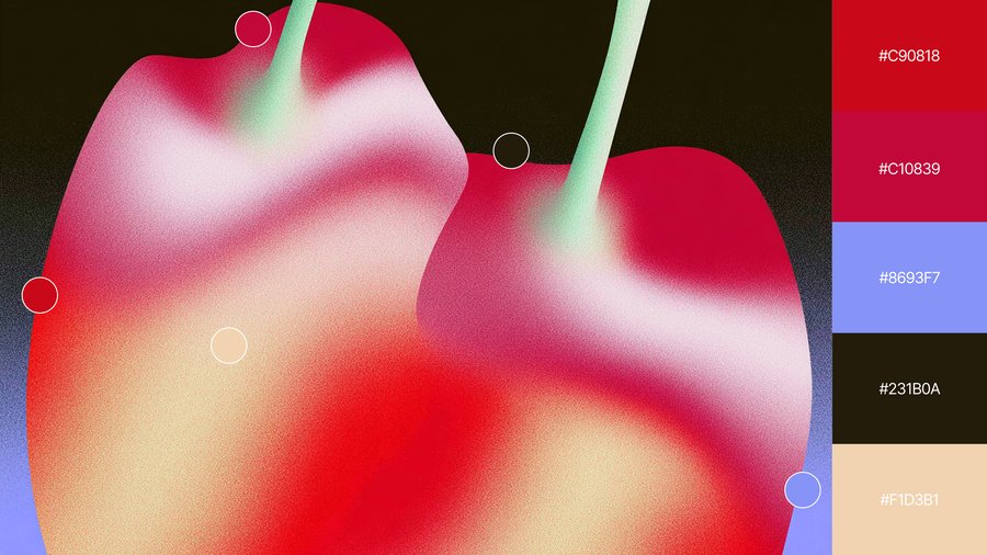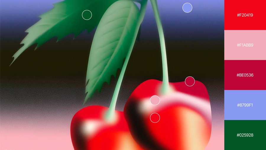 2. Midjourney: 2D-illustration of glossy cherries with soft neon gradient lighting, vaporwave aesthetic, soft grain texture, vibrant gradient bg, smooth shading, abstract digital illustration, high contrast, front view (на основе первого изображения).