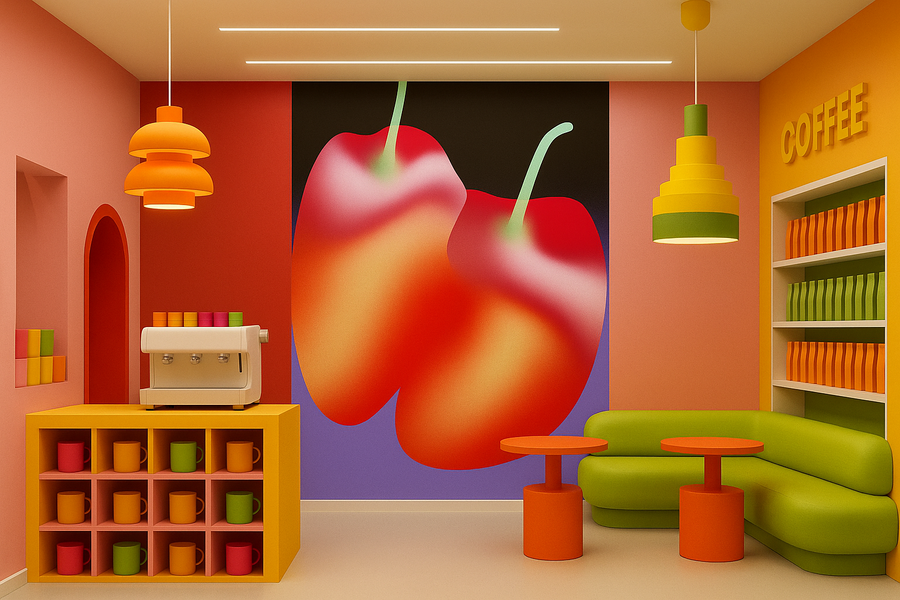 1. Recraft.ai: A vibrant and playful coffee shop interior inspired by modern pop-art aesthetics. The design combines bold geometric shapes and saturated colors — coral pink, green, sunny yellow, and orange. A large, gradient-style mural of an attached image dominates the back wall. The seating area features a curved lime-green sofa paired with bright orange tables, while colorful pendant lamps echo the same palette overhead. On one side, neatly organized shelves display coffee bags and mugs in matching tones.