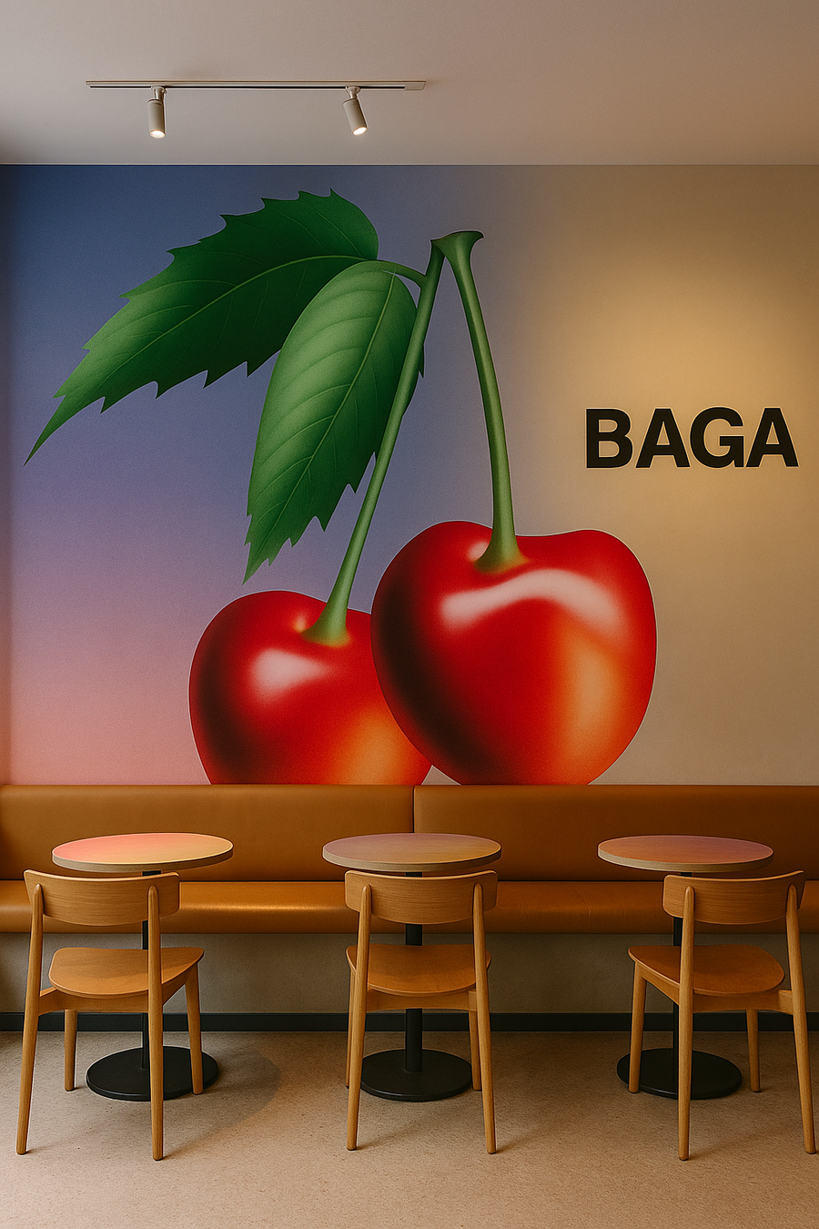 2. Recraft.ai: A realistic photo of my coffee shop interior that’s connected to a retail area. Use the attached image as inspiration for the wall mural: cherry illustration on the wall. Keep the style consistent with the rest of the Baga coffee shop: minimalistic, soft neutral and pastel tones, natural light, clean lines, and modern, funny furniture. Show a seamless transition between the café seating area and the retail shelving space where coffee bags and accessories are displayed.