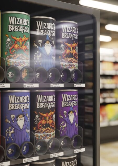 A realistic photo of a vending machine containing tall cylindrical cereal containers labeled 'Wizard’s Breakfast'. The variable packaging designs show medieval fantasy artworks with a wizard and skeletons or other creatures, rendered in a vivid comic-book style. The container text at the bottom lists ingredients. The background is a blurry supermarket The overall scene combines realism with imaginative branding, similar to a modern product advertisement.