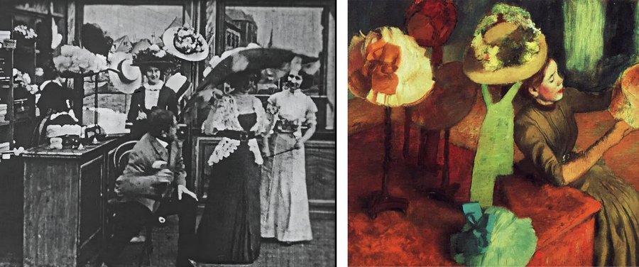 1. «Новая шляпа для мадам», Вигго Ларсен, 1906 // «Завтрак гребцов», Пьер Огюст Ренуар, 1881. 2. «Новая шляпа для мадам», Вигго Ларсен, 1906 // «Дамский магазин», Эдгар Дега, 1885