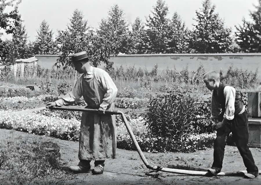 Члены семьи в саду, среди пышных кустов и цветов — распространенный мотив.