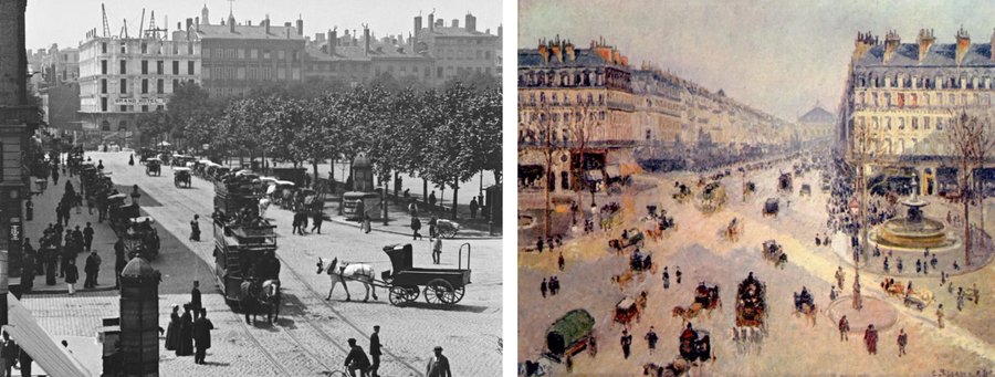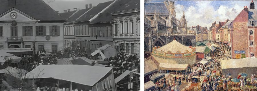 1. «Ярмарка в Лютомере», Карл Гроссман, 1905 // «Ярмарка в Дьеппе. Солнечное утро», Камиль Писсарро, 1901. 2. «Лион, площадь Белькур», бр. Люмьер, 1895 // «Оперный проезд», Камиль Писсарро, 1898