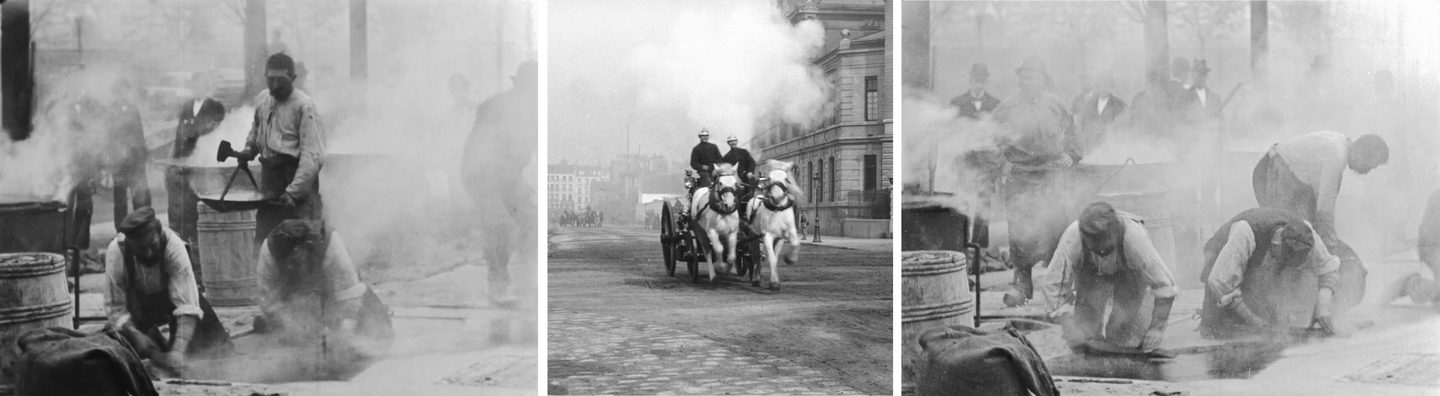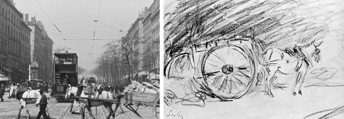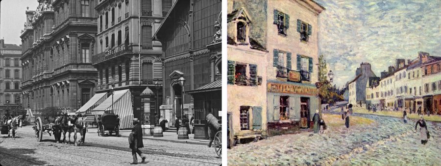 1. «Площадь Корделье в Лионе», бр. Люмьер, 1895 // «Улица в Марли», Альфред Сислей, 1876. 2. «Площадь Понт», бр. Люмьер, 1897 // «Повозка», Альфред Сислей, конец 19 века