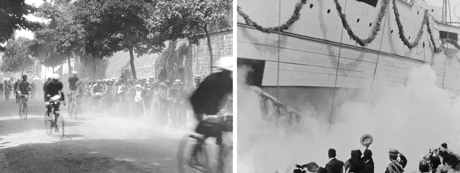 Не только дыхание города, но и люди. Их образ жизни, быт, внешний вид. Хотя Люмьеры и их «коллеги по ремеслу» еще не вполне использовали крупные планы, чтобы сфокусироваться на взгляде или улыбке, но даже случайно попавший в кадр прохожий становится частью портрета эпохи. И художники, и режиссеры задокументировали мгновения как из жизни посещающих театры, кабаре и кафе почтенных господ и дам, так и из суровой повседневности простого люда.