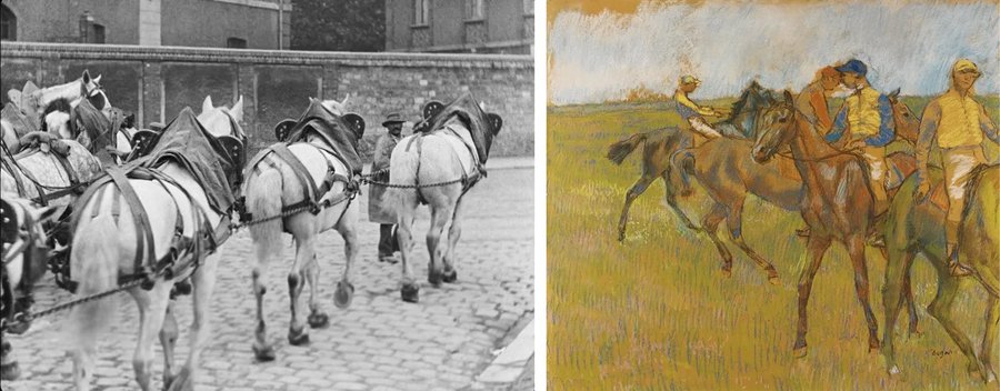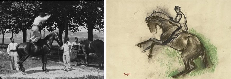 1. «Вольтижировка», бр. Люмьер, 1895 // «Жокей на вздыбившейся лошади», Эдгар Дега, 1881-1885. 2. «Сцепка грузовика», бр. Люмьер, 1897 // «Перед скачками», Эдгар Дега, 1895(?)