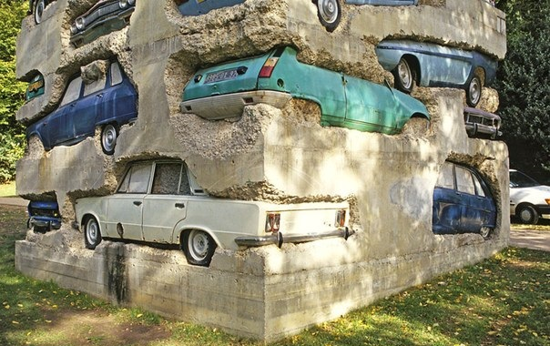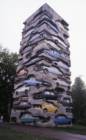 Эта работа — огромная бетонная башня высотой почти 20 метров, в которую, как насекомые в янтаре, вмурованы около 60 настоящих автомобилей. Они расположены слоями, один на другом, и навечно застыли в бетоне.