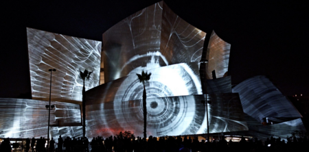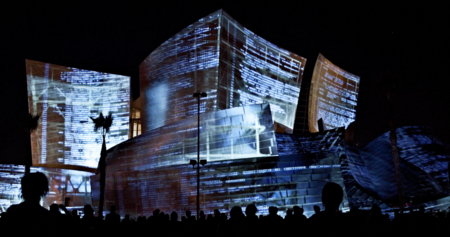 Вот ещё один интересный проект этого автора — «WDCH Dreams» (2018 г.). Инсталляция представляет собой преобразование цифрового архива Лос-Анджелесской филармонии в проекционное шоу на фасаде здания. Архивные материалы — фотографии, нотные партитуры, документы — становятся элементами динамической визуальной композиции.