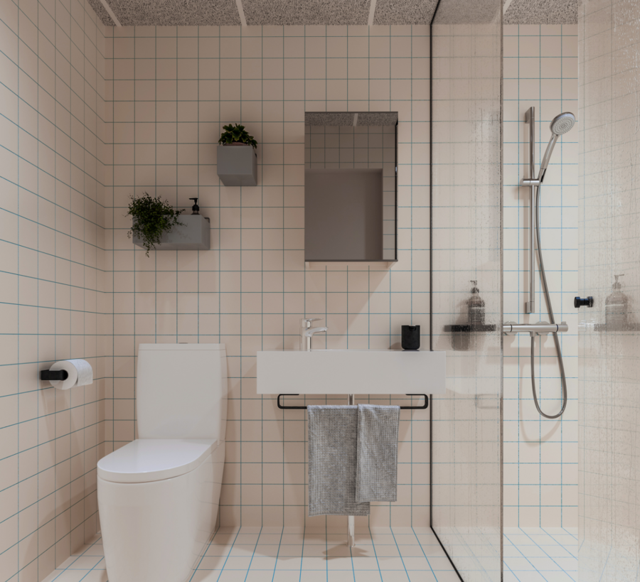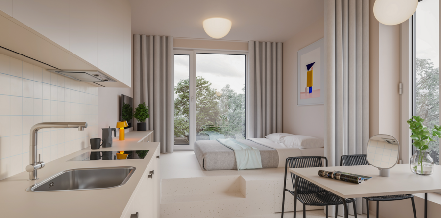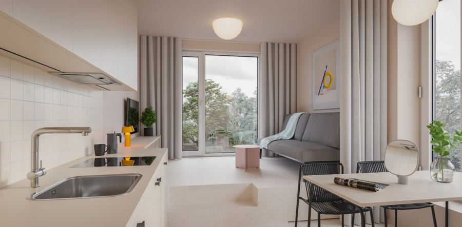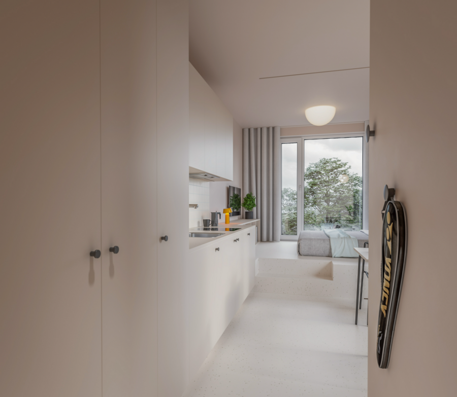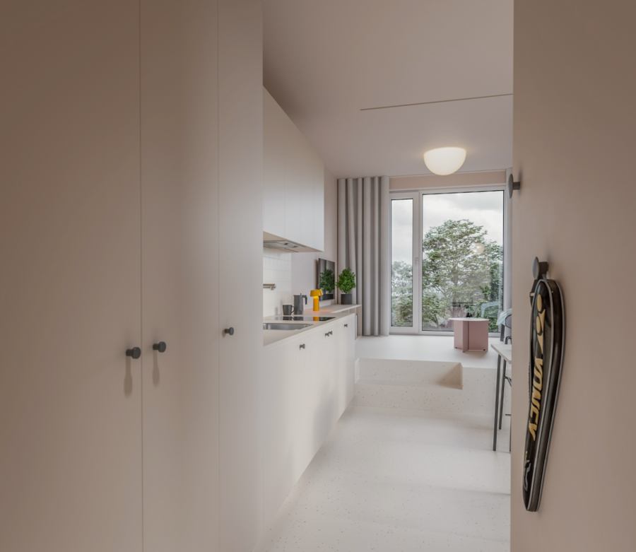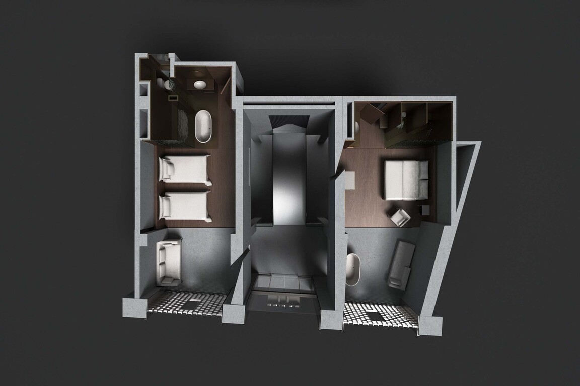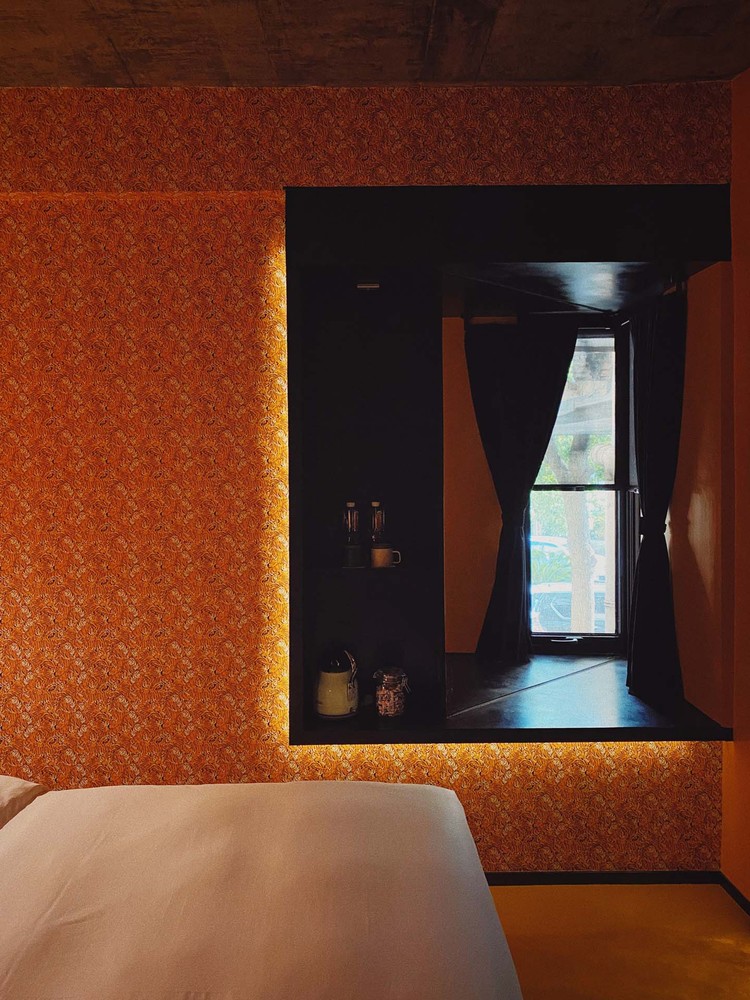 Площадь комнаты составляет 24 кв. м, в ней нет излишнего декора; дизайн пространства — это декор. Окно широко открывается на город, а освещение встроено в стену. Задуманная в духе повторного использования, комната дает новую жизнь материалам, которые ее формируют: розовый пол в душе сделан из преобразованного песка, плитка в ванной комнате сделана из случайных узоров, созданных из различных переработанных материалов, тарелки сделаны из раковин мидий, постельное белье сделано из переработанного постельного белья. Приятно находиться в этом декарбонизированном пространстве, босые ноги касаются сырого земляного пола.