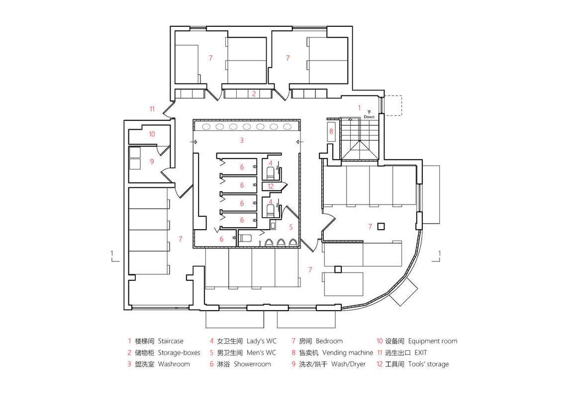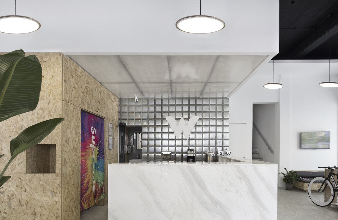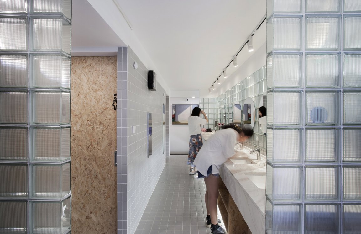 Weflow имеет два этажа, 1 -й этаж — это круглосуточная общественная «гостиная», которая открыта не только для гостей, но и для городской зоны; Второй этаж — это спальная зона, которая предназначена только для гостей хостела. Планировка второго этажа была полностью реорганизована. Все перегородки были удалены, а несущие стены сохранены; пространство вдоль внешней стены организовано как спальни, а ванные комнаты и душевые комнаты сосредоточены посередине. Все перегородки построены из стеклоблоков, чтобы гарантировать, что не только все спальни имеют дневной свет, но и центральная функциональная зона может получать перекрестный свет.