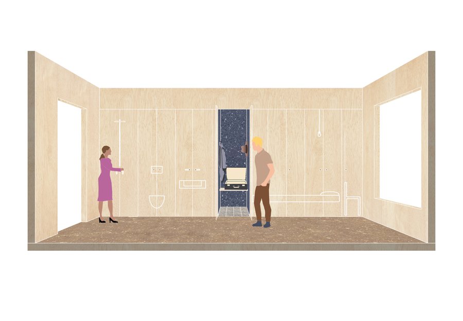 Его стены, сделанные из дерева и покрытые натуральными волокнами, блокируют все звуки и открывают и скрывают функции и компоненты по требованию, от кроватей до шкафов, столов, стульев, душевых кабин и туалетов. Это жилое пространство, спроектированное как модульное, может быть быстро собрано и легко обслуживается и чистится.